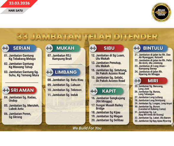 KUCHING, 22 Mac — Sepenyampau 33 projek ngaga jematan di serata Sarawak udah mujur ditinda nyadi sebagi ari komitmen Opis Kereja Raya (JKR) Sarawak ti majak ngenegapka pemansang menua pesisir.