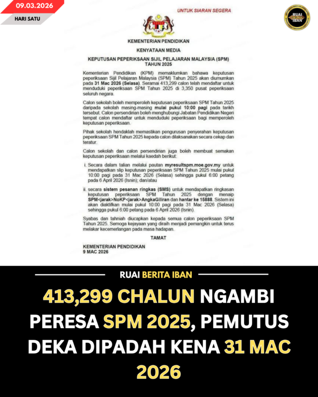 KUALA LUMPUR, 9 Mac — Opis Menteri Pelajar Malaysia (KPM) madahka pemutus peresa Sijil Pelajaran Malaysia (SPM) 2025 deka dipadah kena 31 Mac 2026 (Hari Dua).