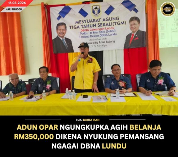 LUNDU, 15 Mac — Kaban Kunsil Nengeri (ADUN) Opar, Billy Sujang madahka agih belanja sepenyampau RM350,000 dikena nyukung pemansang enggau ngenegapka pangku pengawa komuniti nengah Gerempung Bansa Dayak Bidayuh (DBNA) Pampang Lundu.