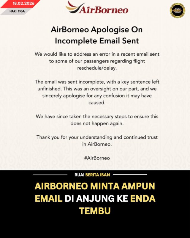 KUCHING, 18 Feb – AirBorneo minta ampun ngagai pesinjir berindik ari pengilap nganjung email notifikasyen bekaul enggau atur baru penerebai bilun sereta pengelaun penerebai bilun ti ditemu enda tembu.