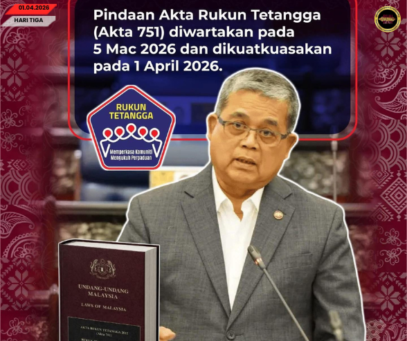 PUTRAJAYA, 1 April — Menteri Penyerakup Menua, Datuk Aaron Ago Dagang, madahka Akta Rukun Tetangga 1975 [Akta 751] (Ubah) 2025 diatu udah berengkah dipejalaika enggau rasmi berengkah sehari tu, nyadi singkang ke besai reti dikena ngenegapka pangku pengawa komuniti ke lantang sereta likun.
