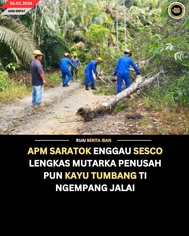 SARATOK, 26 Feb — Raban Penyaga Pengelikun Mensia Mayuh Malaysia (APM) Pelilih Saratok udah nerima kangau ngenyit bekaul enggau penusah pun kayu tumbang ti ngempang jalai besai ba Jalai Nanga Batang Ulu Krian, Saratok.