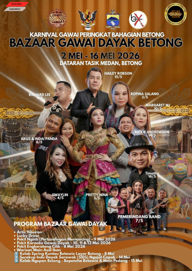 BETONG, 2 April – Karnival Gawai Renggat Bagi Menua di Betong sekali agi diatur nengah Bazaar Gawai Dayak Betong 2026 ti deka berengkah 2 ngagai 16 Mei tu ba Dataran Tasik Medan.