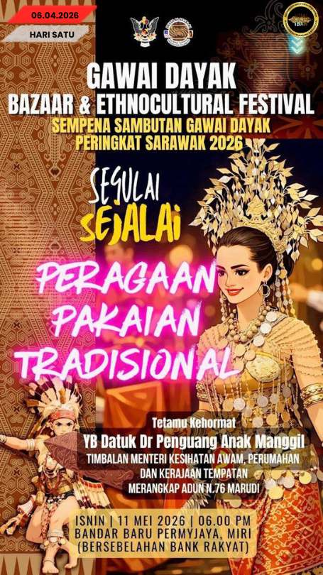 MIRI, 6 April — Beserimbai enggau Pengerami Gawai Dayak Sarawak 2026, Bazar Gawai Dayak enggau Festival Etnobudaya Mandangka Pemakai Asal deka diatur kena Hari Satu, 11 Mei 2026, berengkah ari pukul 6.00 lemai di Bandar Baru Permyjaya, ditu.
