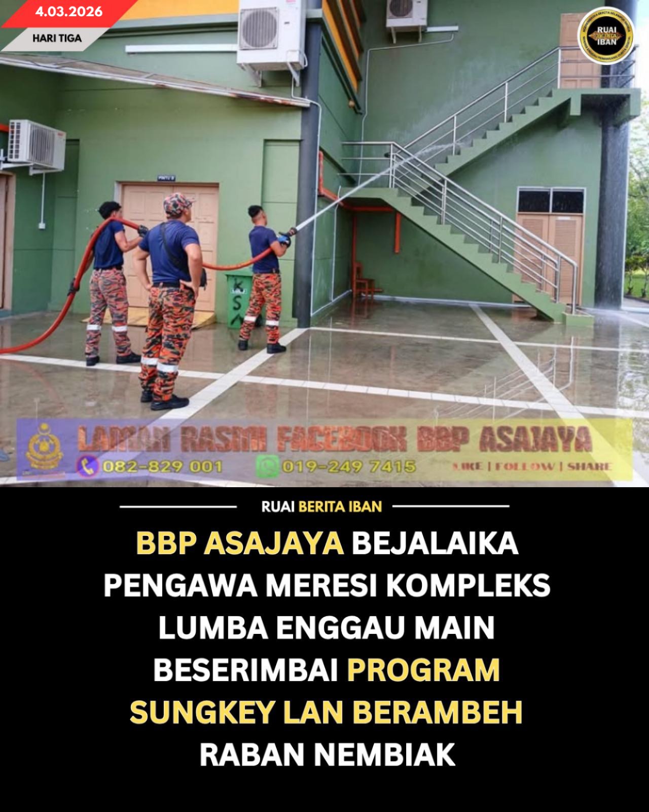 ASAJAYA, 4 Mac — Balai Bomba enggau Penyah Penusah Malaysia (BBP) Asajaya udah bejalaika pengawa ‘flushing’ enggau kereja meresi Kompleks Lumba enggau Main Asajaya nyadi pemungkal nyendiaka diri ungkup ngemujurka ‘Program Lan Berambeh Sungkey Belia’ pelilih Asajaya.