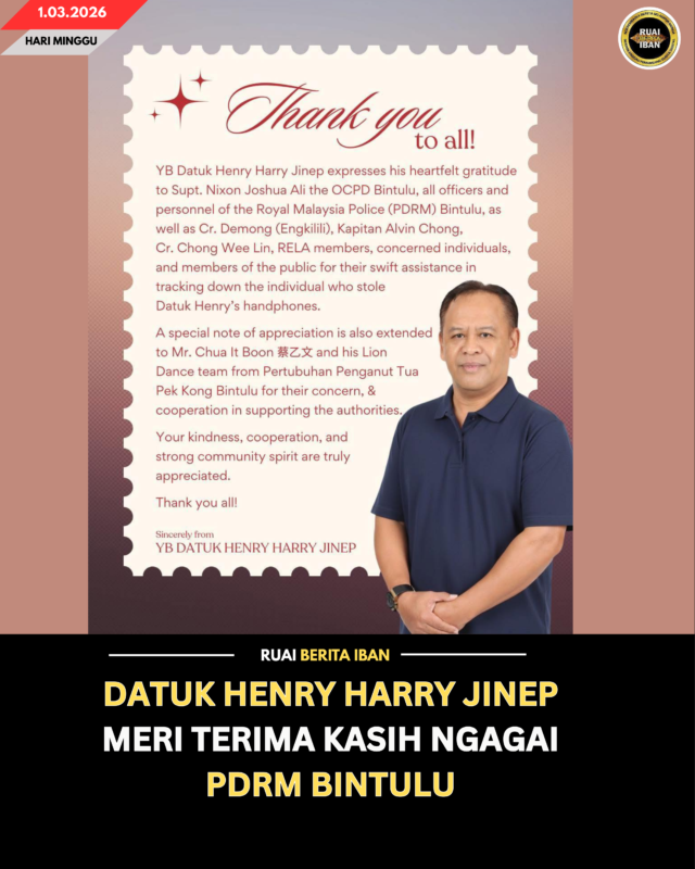 BINTULU, 1 Mac — Datuk Henry Harry Jinep mantaika pengaga ati enggau terima kasih ke pemadu tinggi ngagai polis enggau komuniti lokal ketegal pengawa sida ke jampat mantu nyidi individu ke bisi kaul enggau pengawa enchuri dua iti telefon binching iya apin lama ke udah.