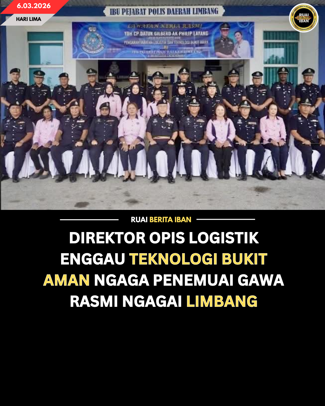LIMBANG, 6 Mac — Direktor Opis Logistik enggau Teknologi Bukit Aman, Pesuruhjaya Polis YDH Datuk Gilberd AK Philip Layang ngaga penemuai kereja rasmi ngagai Pelilih Menua Limbang begulai enggau bini iya, YBhg Datin Siti anak Manau sereta seraban delegasyen ngabas perengka guna logistik enggau operasyen Polis Diraja Malaysia (PDRM) di kandang menua nya, ditu kemari.