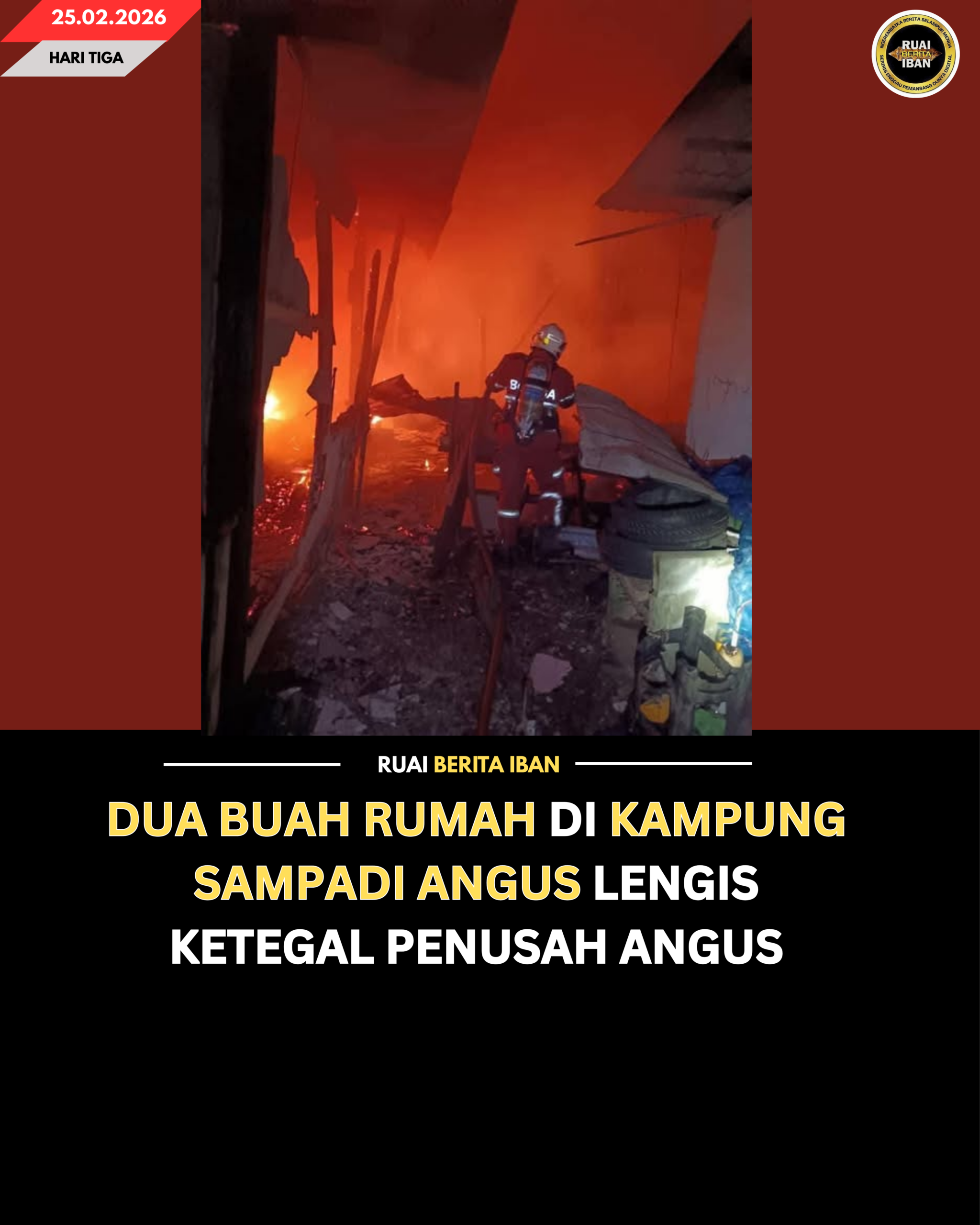LUNDU, 25 Feb — Dua ruang bilik di Kampung Sampadi, ditu, betapi enggau penusah pengudah rumah sida angus lengis ba penusah angus ke nyadi lemai kemari.