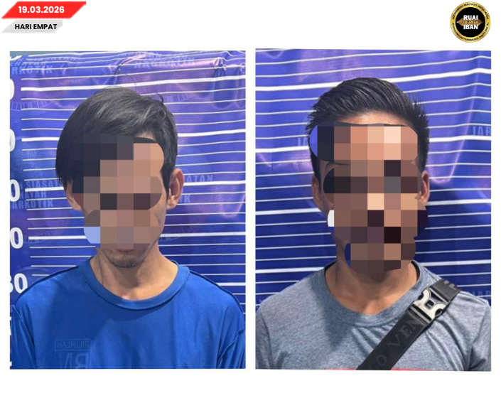 MERADONG, 19 Mac – Ketuai Polis Pelilih Menua Meradong, DSP Tansli Mering madahka dua iku lelaki peranak menua nya udah ditan Raban Petugas IPD Meradong dalam operasyen “Ops Tapis” ti dipejalaika ba kandang pelilih Bintangor, pagi tadi.