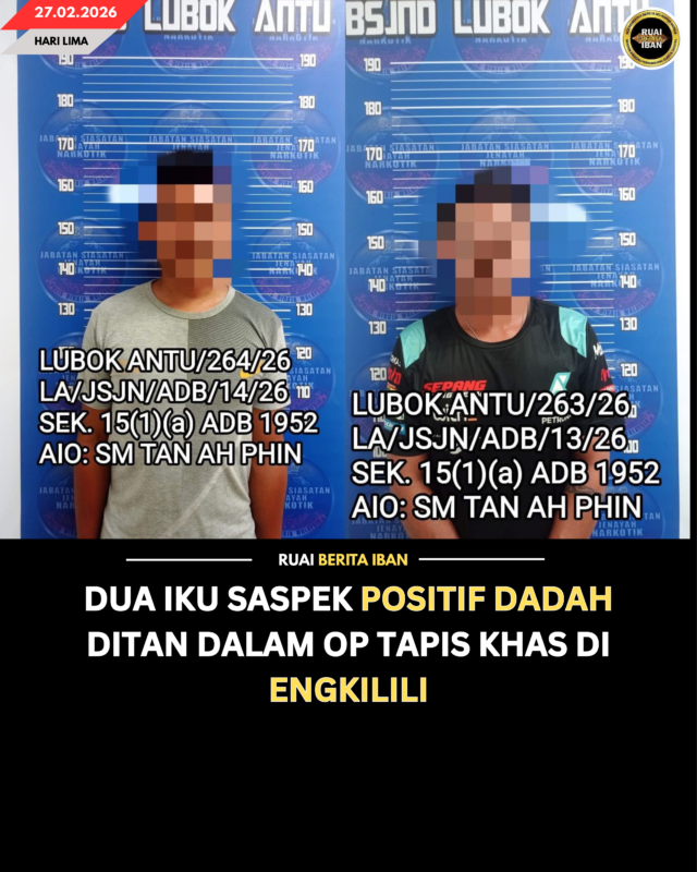 LUBOK ANTU, 27 Feb – Dua iku lelaki beumur urung 30-an enggau 40-an ditan dalam OP Tapis Khas ti dipejalaika tim pemesai enggau kaban Bagian Pansik Jenayah Narkotik (BSJN), Indu Opis Polis Pelilih Lubok Antu di kandang menua Engkelili lemai tadi.