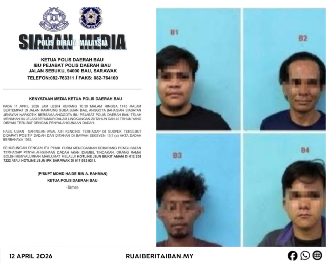 BAU, 12 April — Empat iku lelaki ke beumur entara 20 ngagai 40 taun ditan dalam operasyen Bagi Tasat Jenayah Narkotik begulai enggau kaban Indu Opis Polis Pelilih Bau di Jalai Kampung Suba Buan, ditu, lemai ensanus.