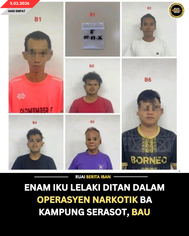 BAU, 5 Mac — Enam iku lelaki beumur entara 18 ngagai 60 taun ditan dalam operasyen ti dipejalaika Bagi Pansik Jenayah Narkotik (BSJN) begulai enggau kaban Indu Opis Polis Pelilih (IPD) Bau ngelingi Kampung Serasot, tumu pagi tadi.