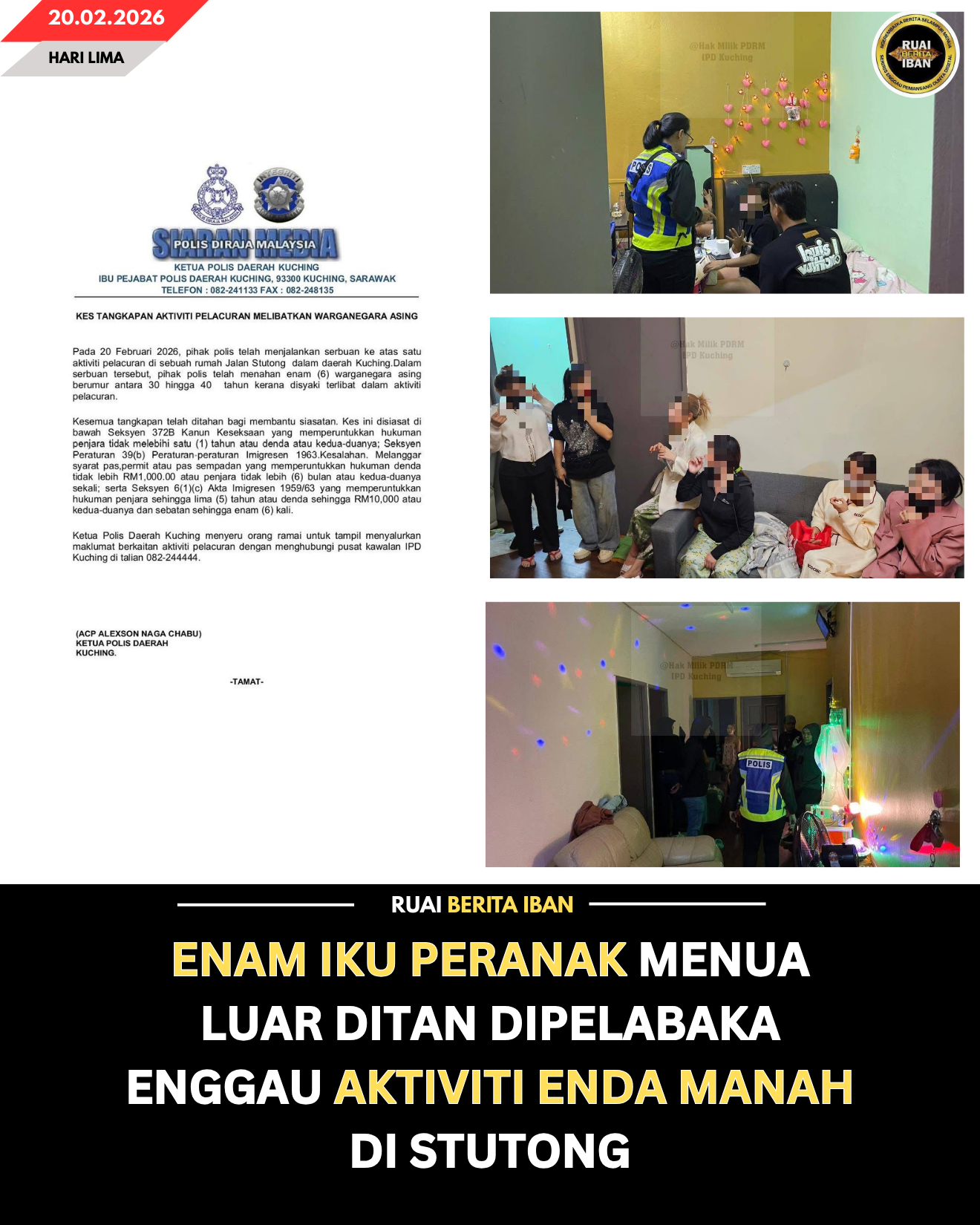 KUCHING, 20 Feb – Polis udah ngetan enam iku peranak menua luar dalam pengawa datai ngenyit ngagai sebuah rumah di Jalai Stutong, ditu ke dipelabaka bejalaika aktiviti nyundal.