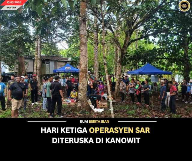 KANOWIT, 10 Mac — Operasyen Ngiga enggau Nyelamat (SAR) ungkup kes orang ke lenyau ba kandang kampung semak Jalai Penyulau/Lukut, Kanowit diteruska ngagai hari ketiga sehari tu enggau operasyen berengkah tumu pukul 8.00 pagi.