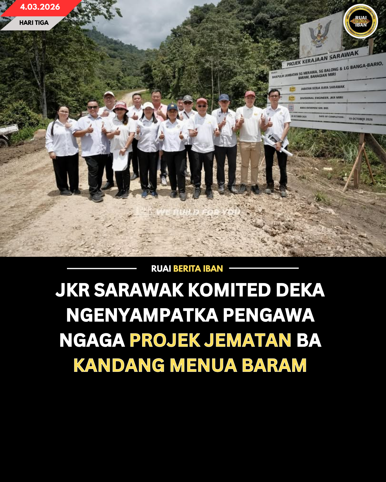 LONG BANGA, 4 Mac — Direktor Kereja Raya Sarawak, YBhg. Adj Prof Ir Ts Gs Br PMr Dr Cassidy anak Morris udah ngatur Penemuai Ngenegapka Projek Siri Kedua dikena beratika pejalai pengawa bejalaika projek ngemanahka Jematan Sungai Peluan di Long Banga, Baram.