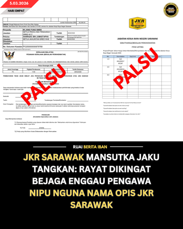 KUCHING, 5 Mac — Opis Kereja Raya (JKR) Sarawak ngingatka mensia mayuh, kunteriktor enggau pemekal ngambika seruran bejimat enggau individu tauka piak ti nyaru diri nyadi pemesai tauka pengari opis nya enggau tuju nipu.