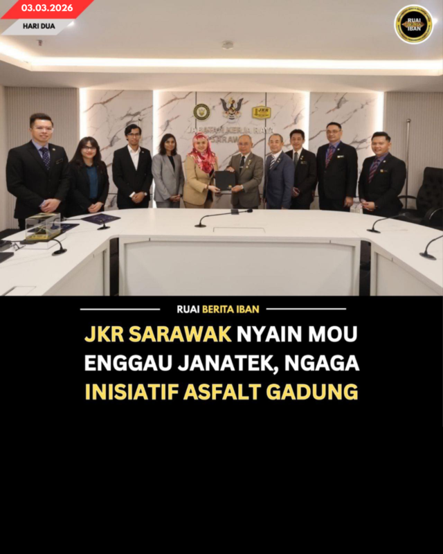 KUCHING, 3 Mac — Opis Kereja Raya Sarawak (JKR Sarawak) udah nyain Sempekat Pemereti Ati (MoU) enggau Janatek dikena bejalaika inisiatif Ngaga Asfalt Gadung di nengeri tu.