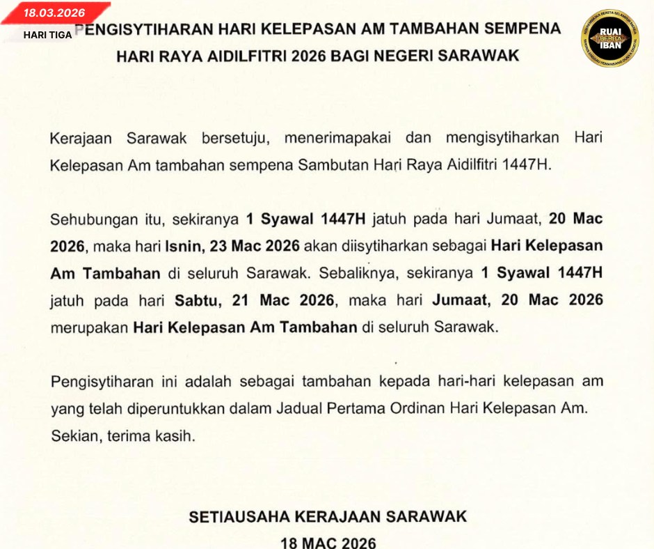 KUCHING, 18 Mac – Perintah Sarawak netapka Hari Besai Kemisi tambah beserimbai enggau pengerami Hari Raya Aidilfitri 1447H.