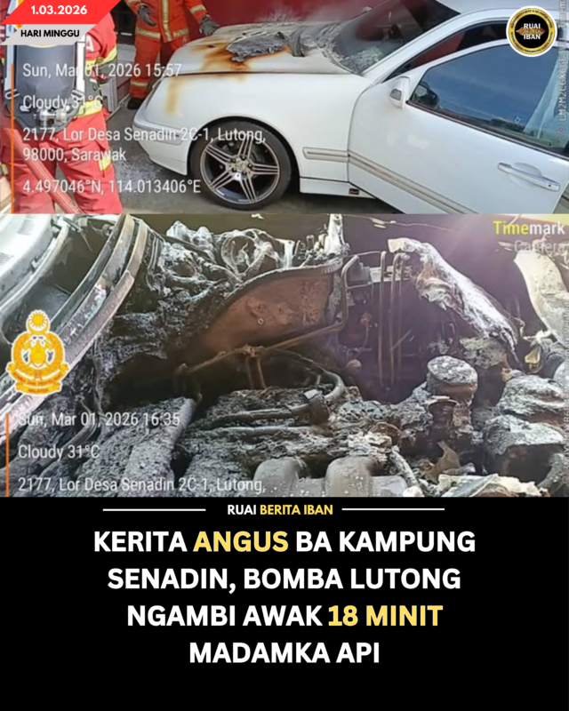 MIRI, 1 Mac – Sebuah kerita Mercedes Benz E240 angus ba penusah ke nyadi ba Desa Senadin Fasa 2C, lemai tadi, tang pengawa jampat raban Balai Bomba enggau Penyah Penusah (BBP) Lutong mujur nagang penusah nya ari majak balat.
