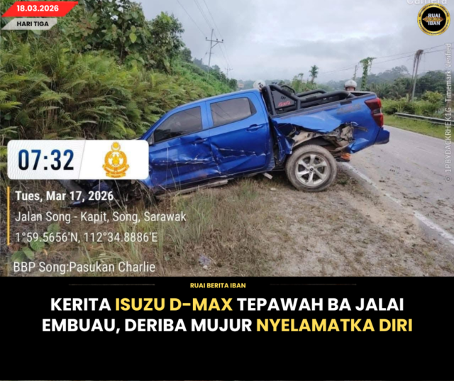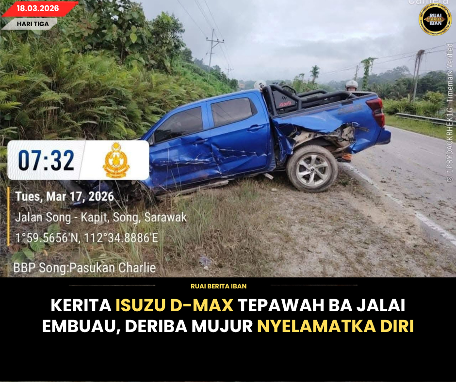 SONG, 18 Mac — Siku deriba napi penusah lebuh kerita pacuan empat roda ti ditepan iya lenyau jaga dalam penusah eksiden kediri empu ba Jalai Embuau, urung pukul 7.20 pagi, kemari.