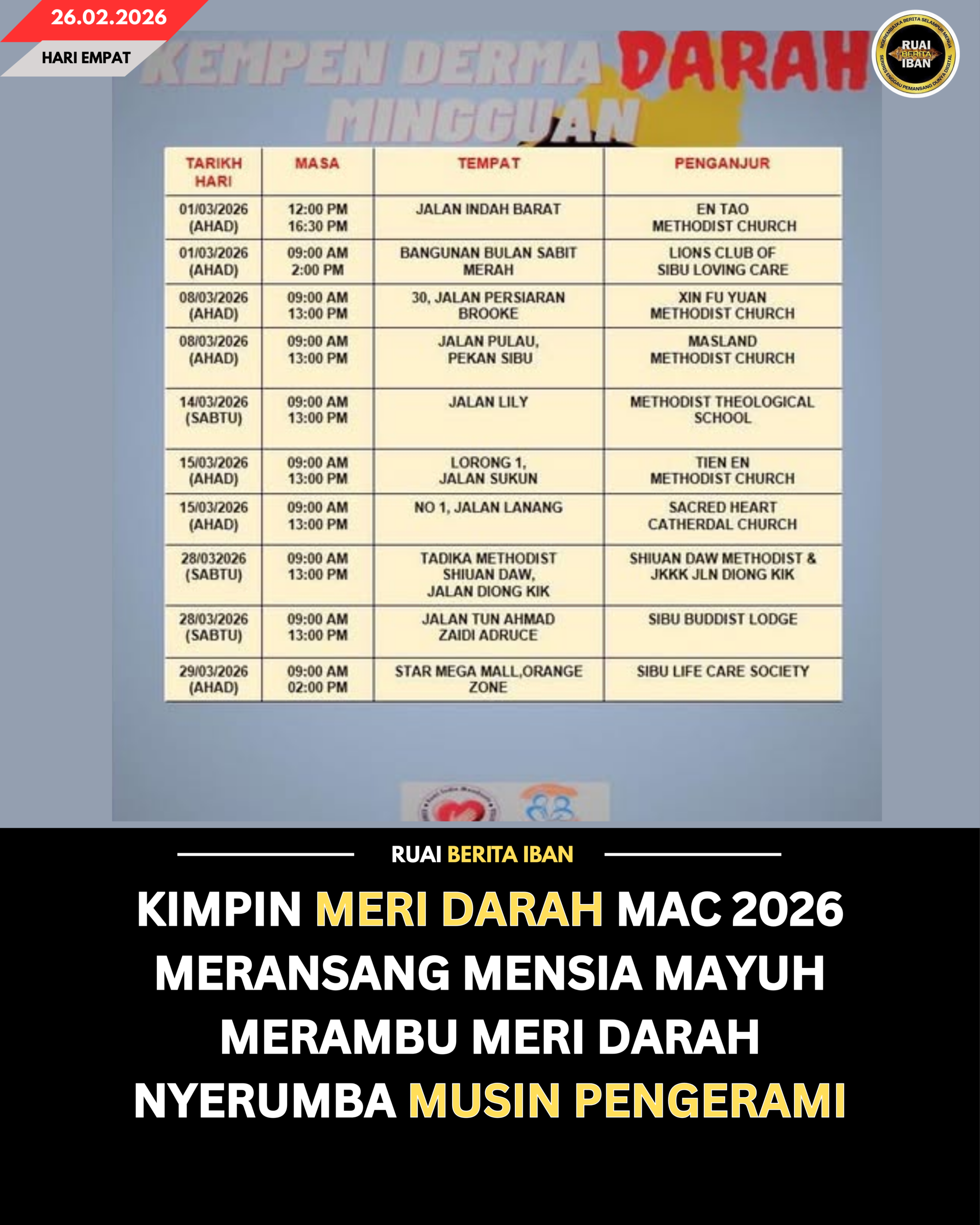 SIBU, 26 Feb — Mensia mayuh diperansang merambu meri darah sepemanjai bulan Mac 2026 dikena nentuka bekal darah seruran chukup, kelebih agi nyerumba musin pengerami ti deka datai.