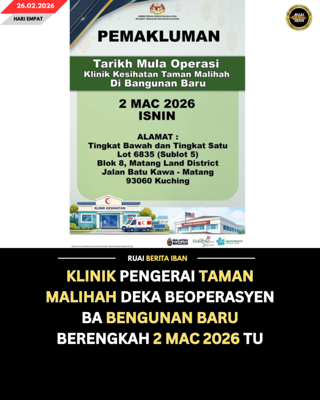 KUCHING, 26 Feb — Opis Pengerai Bagi Menua Kuching madahka Klinik Pengerai Taman Malihah deka berengkah beoperasyen ba begunan baru berengkah ari Hari Satu, 2 Mac 2026 tu.