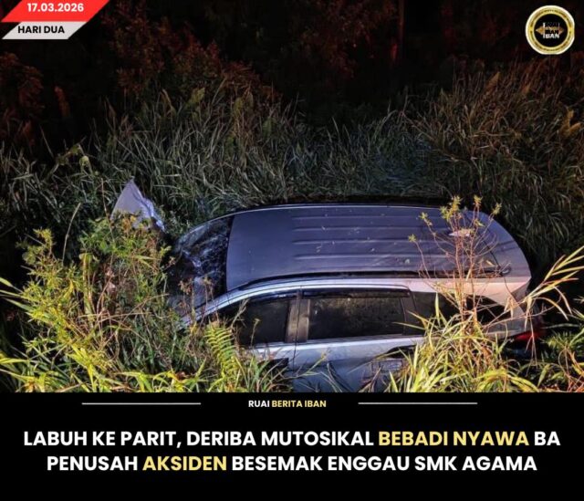 Ba penusah ke nyadi urung pukul 12.32 tengah malam, tudah ke nepan mutosikal Yamaha LC ditemu labuh ke dalam parit besemak enggau endur penusah nyadi.