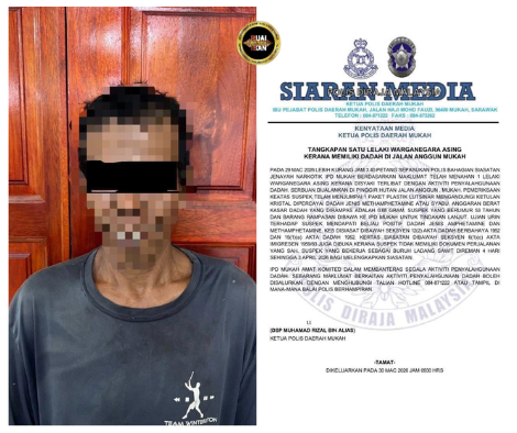 “Asil ari pengawa meresa saspek tetemuka bungkus plastik senayau ti ngundan gumpal kristal ti dipelaba methamphetamine tauka syabu enggau anggar pemerat kasar 0.68 gram,” ku iya nengah penerang media sehari tu.