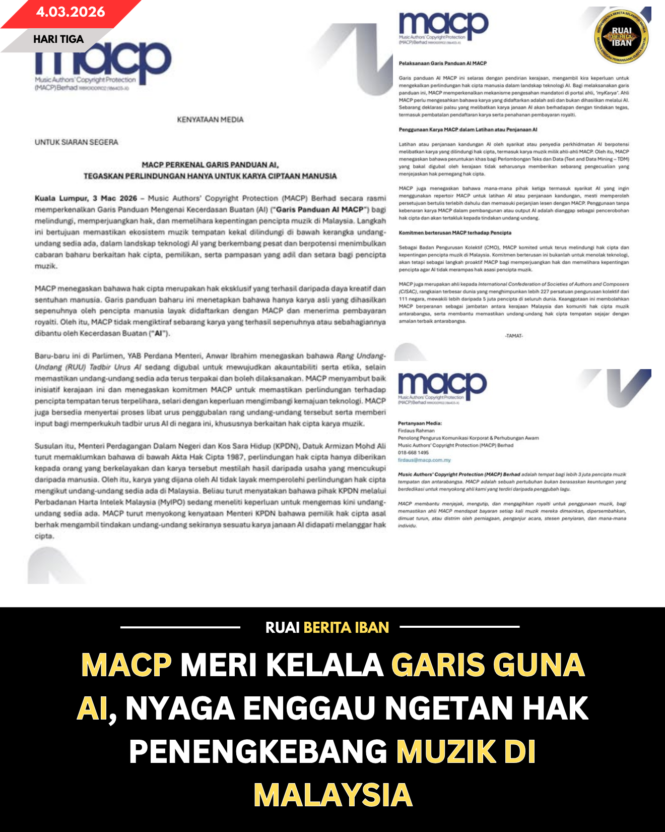 KUALA LUMPUR, 4 Mac – Perlindungan Hak Cipta Pengarang Muzik (MACP) Berhad udah meri kelala enggau rasmi Garis Lalau Pemintar Tiruan (AI) (“Garis Lalau MACP AI”) dikena nyaga, ngetanka hak sereta nyaga pemerat penengkebang muzik di Malaysia.