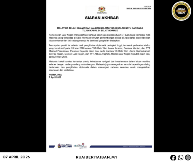 PUTRAJAYA, 7 April – Malaysia nerima pemansang ke positif lebuh sebuah ari tujuh buah kapal komersial enggi menua tu ke tepekul ba Selat Hormuz berindik ari gaya ke diatu charut di Asia Barat, diberi jalai ke likun lalu diatu benung dalam pejalai nuju palan ke udah ditetapka.