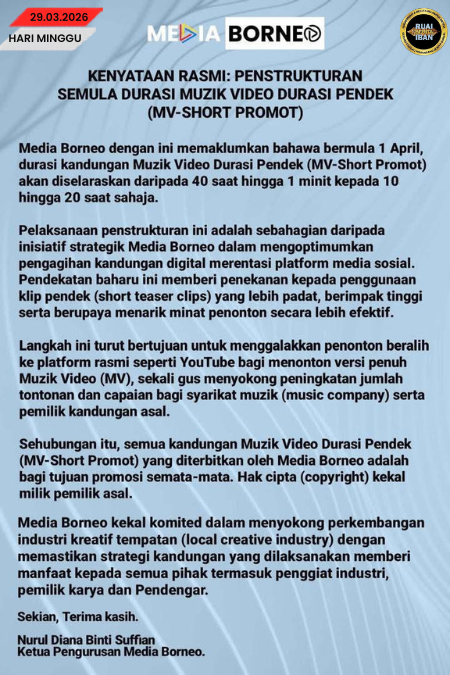 KUCHING, 29 Mac — Media Borneo madahka berengkah 1 April 2026, timpuh isi Video Muzik Timpuh Pandak (MV-Short Promot) deka diseliris ari 40 sikin nyentuk 1 minit ngagai semina 10 ngagai 20 sikin aja.