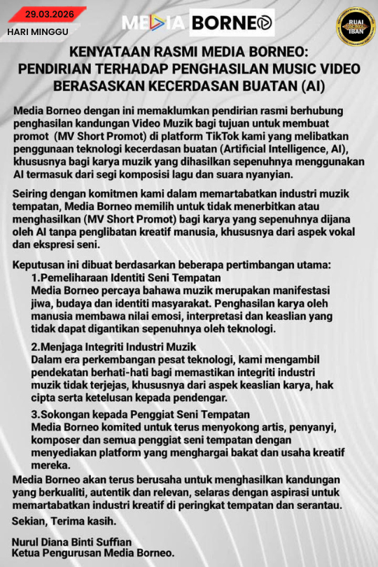 KUCHING, 29 Mac — Media Borneo nyemetak madahka penetap ati enda mansut tauka ngasilka isi video muzik promosyen pandak (MV Short Promot) ti dipansutka sepenuh iya ngena teknologi pemintar tiru (AI) ti nadai kaul enggau kreatif mensia.