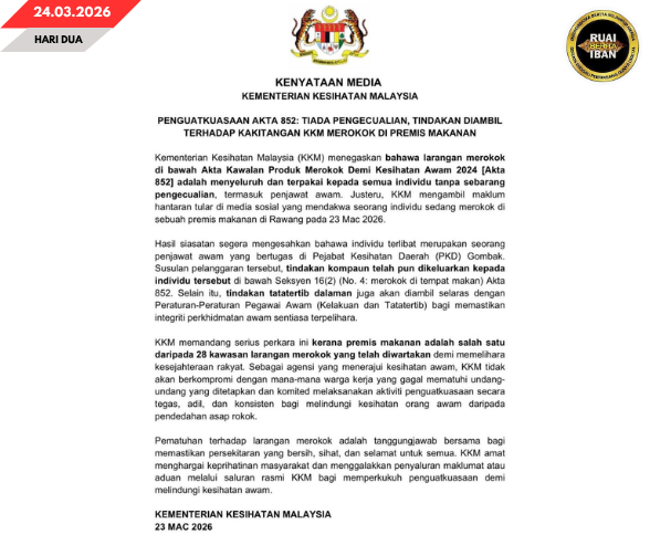 KUALA LUMPUR, 24 Mac — Opis Menteri Pengerai Malaysia (KKM) nyemetak madahka nadai dikelaung ba pengawa nagang nginsap ari baruh Akta Kawalan Produk Merokok Demi Kesihatan Awam 2024 (Akta 852), nyengkaum ngaul pengereja pengawa perintah.