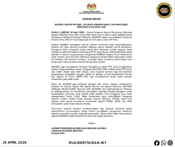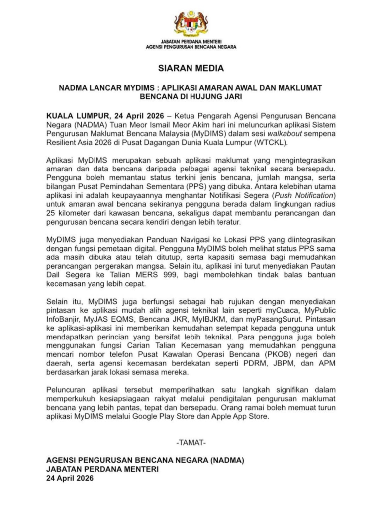 KUALA LUMPUR, 25 April – Ejensi Pengatur Penusah Ngenyit Menua (NADMA) sehari tu ngelancharka Sistem Pengatur Penerang Penusah Ngenyit Malaysia (MyDIMS), aplikasyen digital begulai ti nyendiaka penerang penusah ngenyit maya nyata enggau jaku tangkan tumu ngagai mensia mayuh.