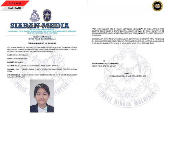 MUKAH, 31 Mac – Polis DiRaja Malaysia (PDRM) minta saup mensia mayuh ngiga siku nembiak indu beumur 15 taun ke diripotka lenyau di Mukah tumu pagi tadi.