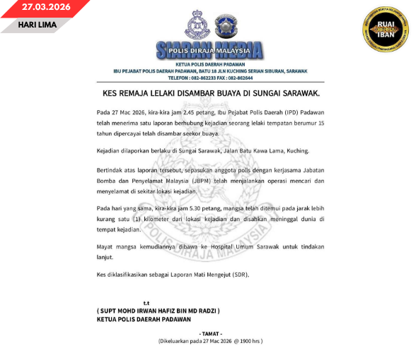 KUCHING, 27 Mac — Siku nembiak beumur 15 taun diripotka lesi pengudah ditagup baya di Sungai Sarawak, semak Jalai Batu Kawa Lama, Kuching.