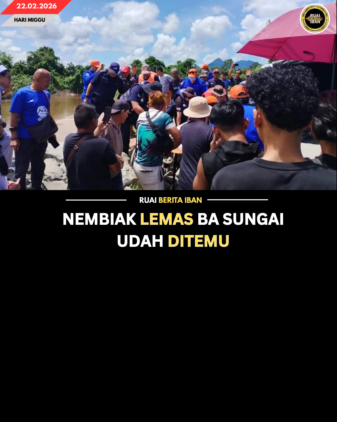 KUCHING, 22 Feb – Pengudah dua hari lenyau, pengujung iya tubuh siku nembiak lelaki beumur 16 taun ke labuh ba Sungai Kolong, Sungai Tengah kena Hari Lima nyin tadi udah ditemu sehari tu.
