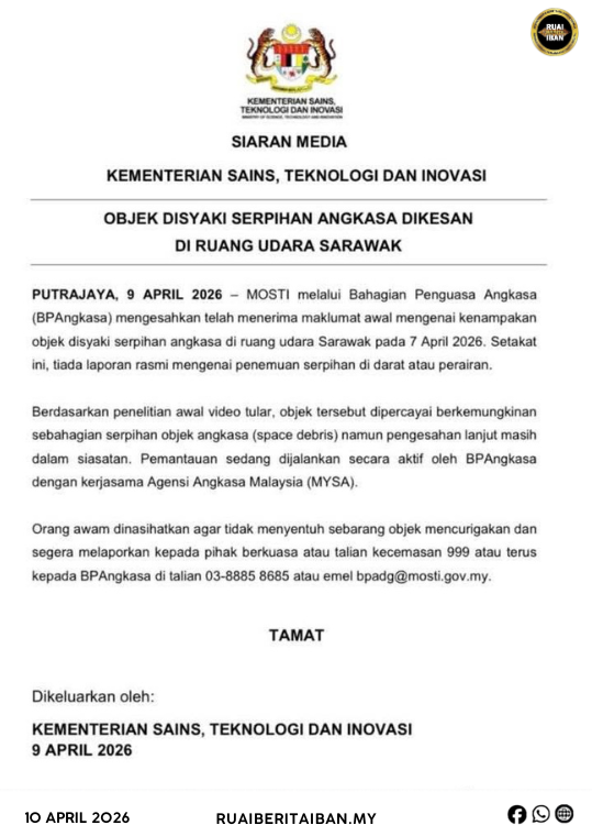 PUTRAJAYA, 10 APRIL — Opis Menteri Sains, Teknologi enggau Inovasi (MOSTI) nengah Bagian Kaunsil Angkasa (BPAngkasa) ngentaska udah nerima penerang keterubah bekaul enggau pengawa meda objek ke dipelabaka kerimpak angkasa ba kandang langit Sarawak kena 7 April 2026.