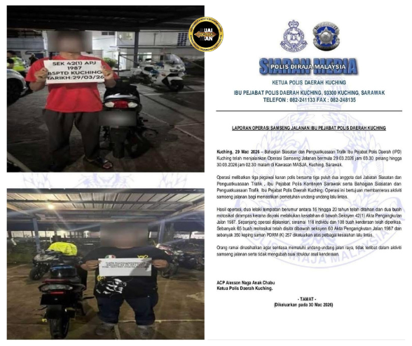 KUCHING, 30 Mac – Sepenyampau 118 iku individu enggau 108 buah entukar udah diperesa lalu 65 buah mutosikal mega dirampas ari baruh Seksyen 60 Akta Pengangkutan Jalan 1987, kelimpah ari 350 iti saman PDRM ti dikeluar ketegal mayuh macham penyalah trafik.