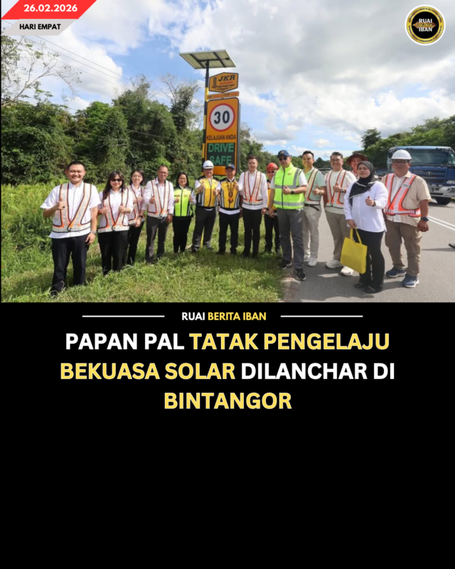 BINTANGOR, 26 Feb – Pengawa ngangkatka pengelikun jalai alun di Sarawak majak ditegapka lebuh Opis Kereja Raya (JKR) Sarawak ngelancharka Papan Pal Tatak Pengelaju Jalai Bekuasa Solar di Jalai Tg. Genting kemari.