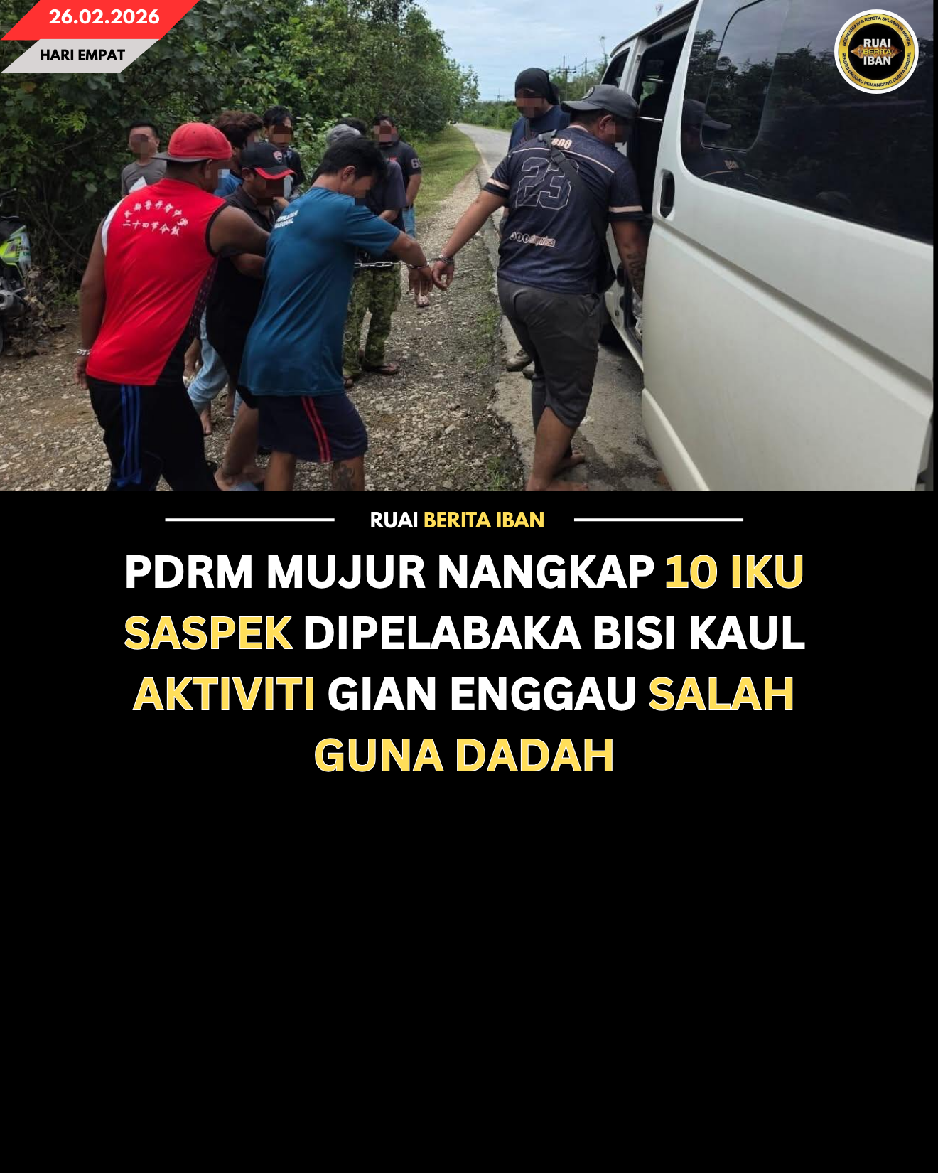 BINTULU, 26 Feb — Polis Diraja Malaysia (PDRM) mujur nangkap 10 iku lelaki nyengkaum lapan iku peranak menua tu empu enggau dua iku peranak Indonesia dalam operasyen bersepadu ngelingi Bintulu, Sarawak kena 25 Februari tu tadi.