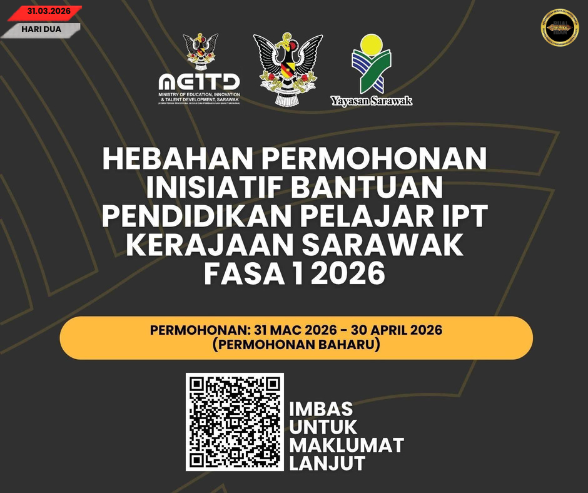 KUCHING, 31 Mac — Perintah Sarawak nengah Yayasan Sarawak muka peminta Inisiatif Bantu Pelajar Palan Pelajar Tinggi (IPT) Renggat 1 taun 2026 ngagai nembiak ke patut berengkah sehari tu.
