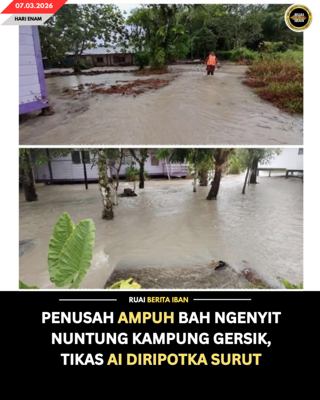 KUCHING, 7 Mac — Penusah ampuh bah ngenyit diripot nyadi ba Lorong 4, Kampung Gersik pagi tadi, berindik ari ujan bangat ke nuntung kandang endur nya.