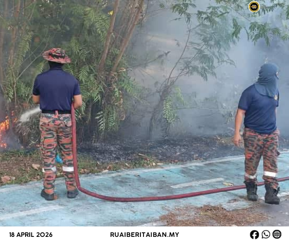 MIRI, 18 April — Penyikar enggau pengelengkas tim Balai Bomba enggau Penyah Penusah (BBP) Lutong mujur ngerara penusah babas angus ke nyadi ba kandang Padang Golf Pulau Melayu, lemai tu tadi.
