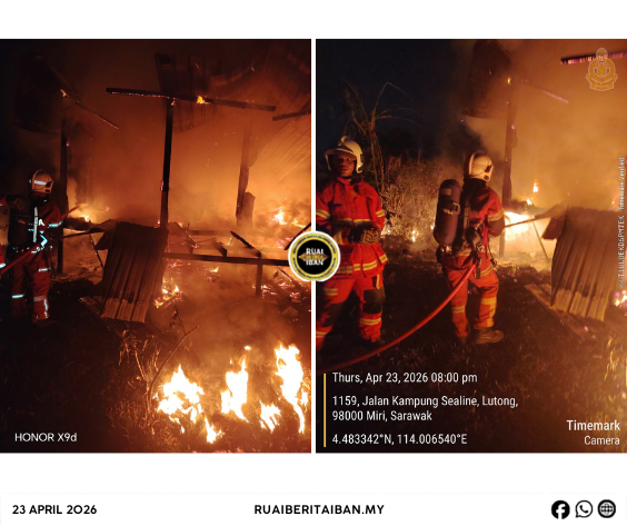 Miri, 23 April – Sebuah rumah ukai tetap udah angus ba Jalai Sealine 2, Kampung Sealine, Lutong malam tadi.