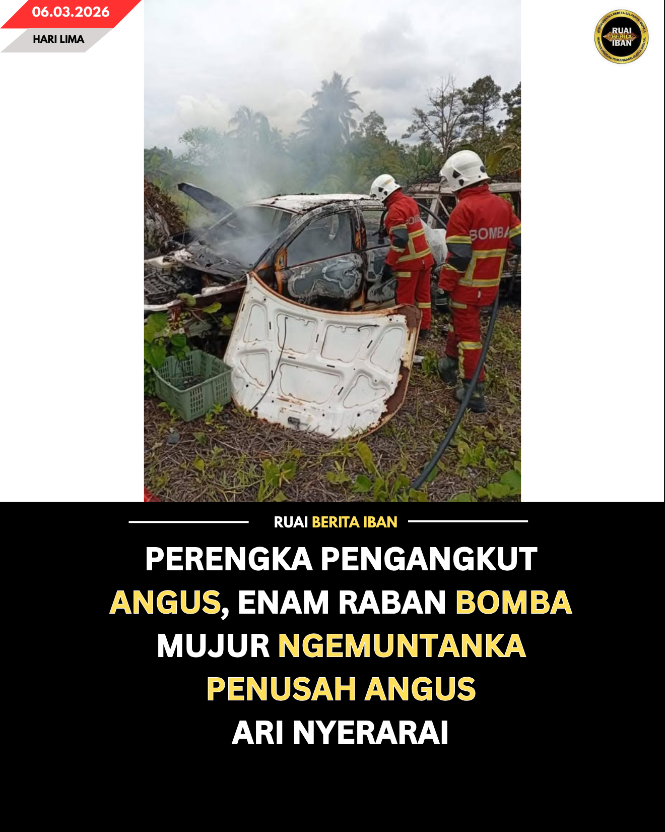 ASAJAYA, 6 Mac — Pengelantang peranak di Kampung Tambirat, Jalai Asajaya tejanggal enda lama lebuh endur nyimpan perengka pengangkut ke udah ditinggal dia diripotka angus, urung pukul 12.50 tengah hari.