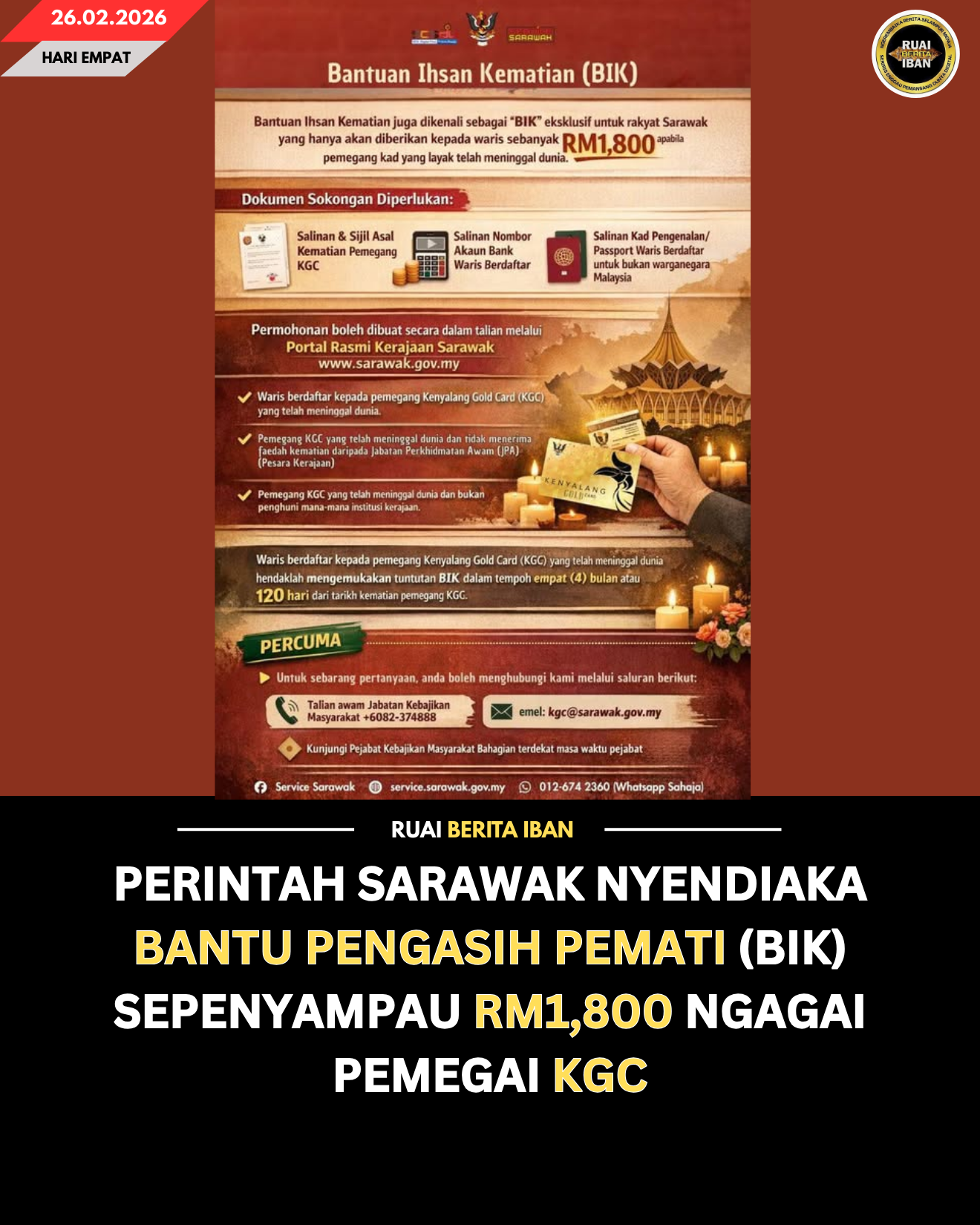 PERINTAH SARAWAK NYENDIAKA BANTU PENGASIH PEMATI (BIK) SEPENYAMPAU RM1,800 NGAGAI PEMEGAI KGC