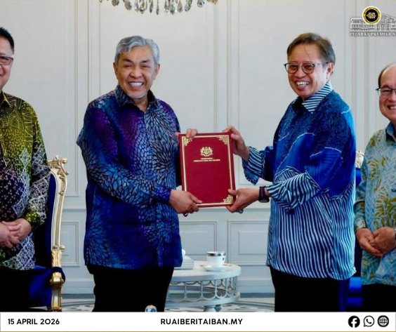 KUCHING, 15 April — Premier Sarawak, Datuk Patinggi Tan Sri (Dr) Abang Haji Abdul Rahman Zohari bin Tun Datuk Abang Haji Openg udah nerima penemuai basa ari Sapit Menteri Besai, Dato’ Seri Dr. Ahmad Zahid bin Hamidi dalam aum ke diatur ba Sri Pertiwi, Petra Jaya, lemai kemari.