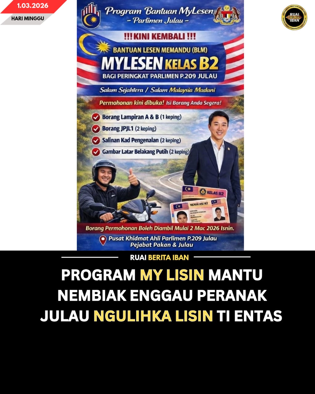 PAKAN, 1 Mac – Inisiatif Program My Lisin ba sitak Parlimen Julau dipeda nyadi singkang proaktif dikena mantu raban nembiak enggau peranak menua pesisir ngulihka lisin mutosikal nengah chara ti entas sereta teratur.