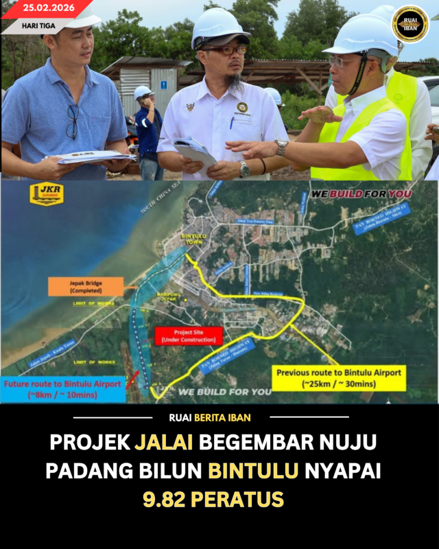BINTULU, 25 Feb — Projek ngaga dua jalai kerita sepemanjai 4.1 kilometer nuju Padang Bilun Bintulu ti digaga nitihka standard JKR U5 diatu udah ngerikod penyulut fizikal 9.82 peratus lalu dipelaba tembu penuh dalam bulan Oktober 2027.